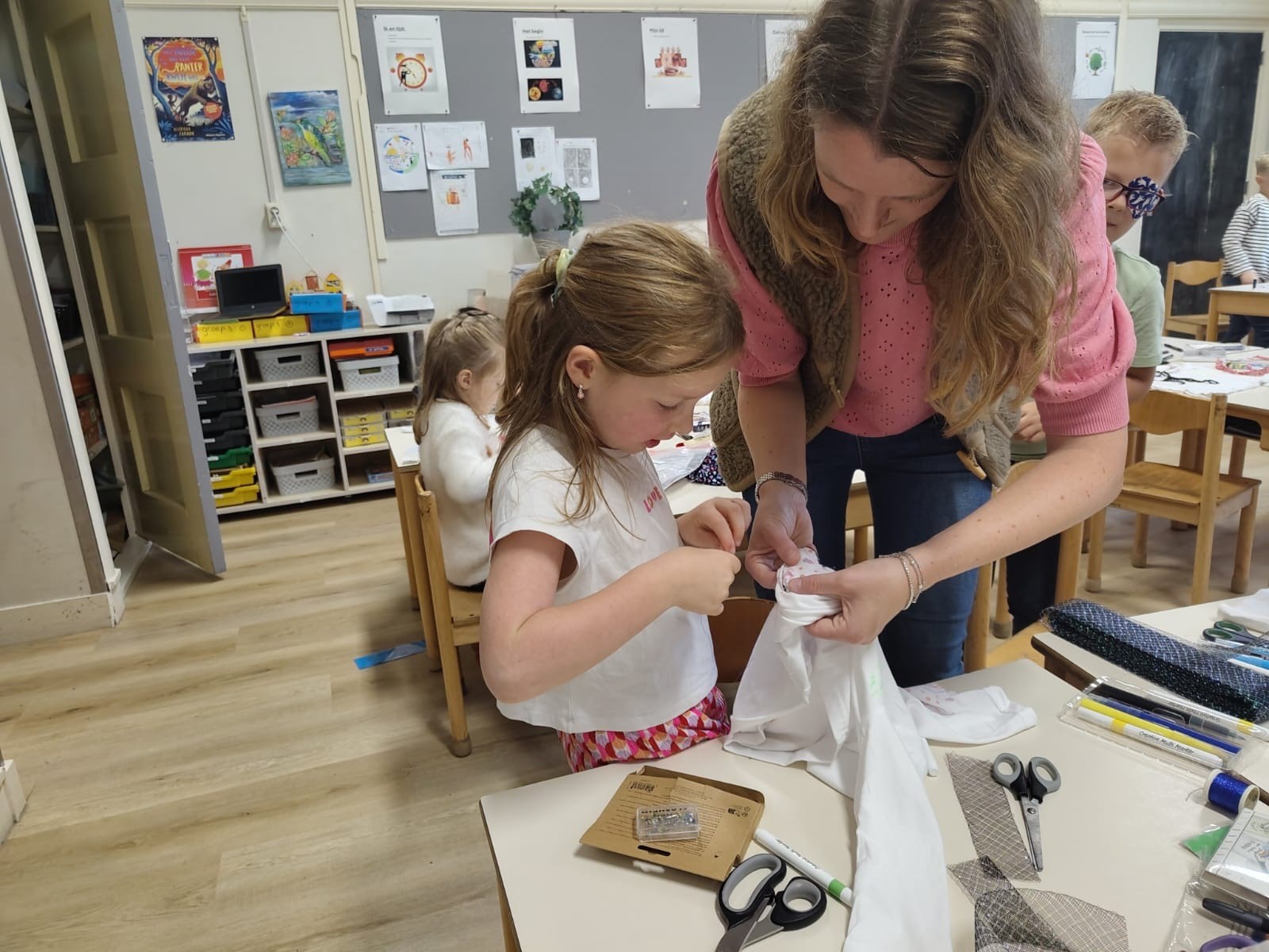 Gisteren leek onze klas wel een naaiatelier! De kinderen zijn bezig om een wit T-shirt te pimpen. Zij mogen stofjes, band, lint, knopen en textielstiften gebruiken. Er werd met de hand genaaid, maar ook met de naaimachine van juf Renée. Nieuwsgierig hoe de T-shirts eruit gaan zien....? Na 16 oktober post ik het resultaat!