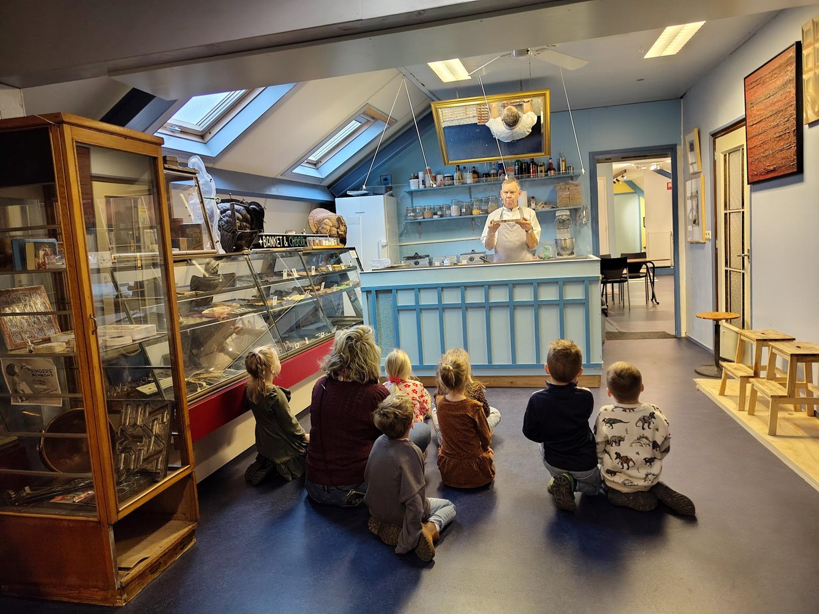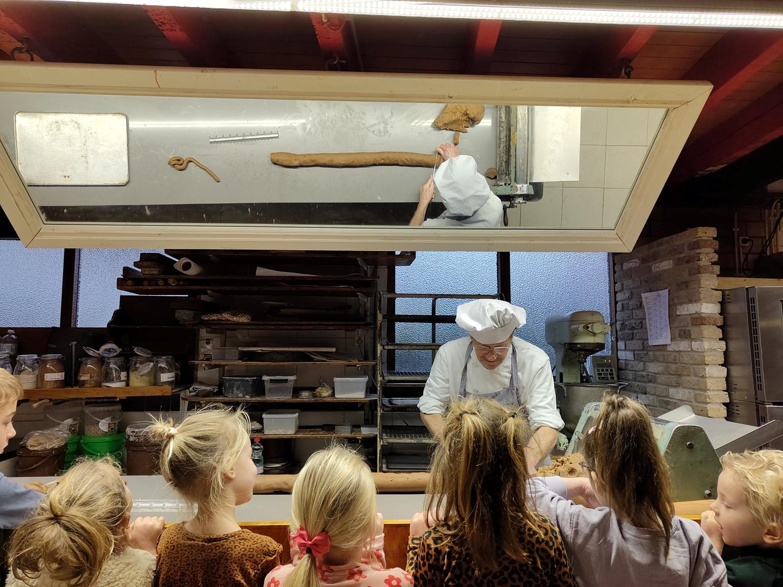 De kinderen werden onder alle auto’s verdeeld en we reden gezamenlijk als één lange stoet richting Medemblik. Eenmaal daar aangekomen gingen we tegelijkertijd naar binnen en we konden na het ophangen van de jassen direct plaatsnemen bij de bakker. De bakker was op dat moment druk in de weer met speculaasdeeg en de kinderen keken vol verwondering mee. De gehele groep werd vervolgens verdeeld in vier kleine groepjes en we zijn daarna aan de slag gegaan met verschillende workshops; pepernoten rollen, een film kijken, speculaas versieren en uitleg over het maken van chocoladebonbons. De kinderen vonden het ontzettend leuk en we kijken terug op een geslaagde ochtend bij het bakkerijmuseum!