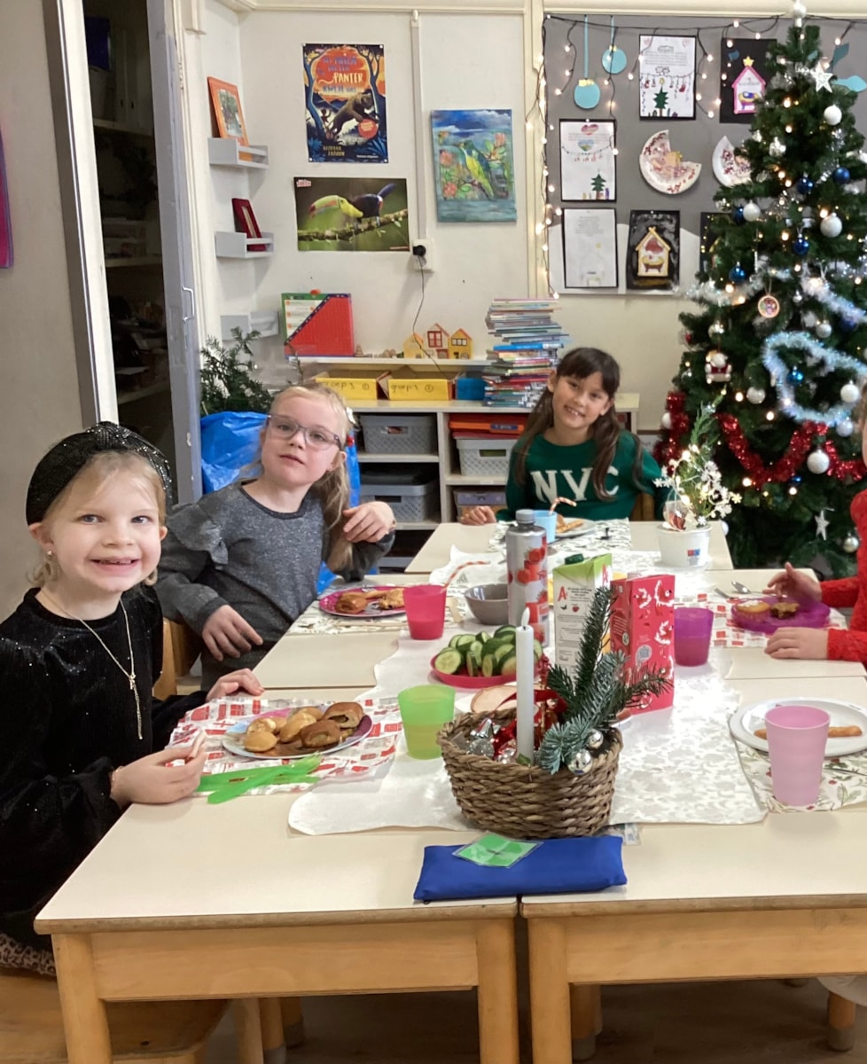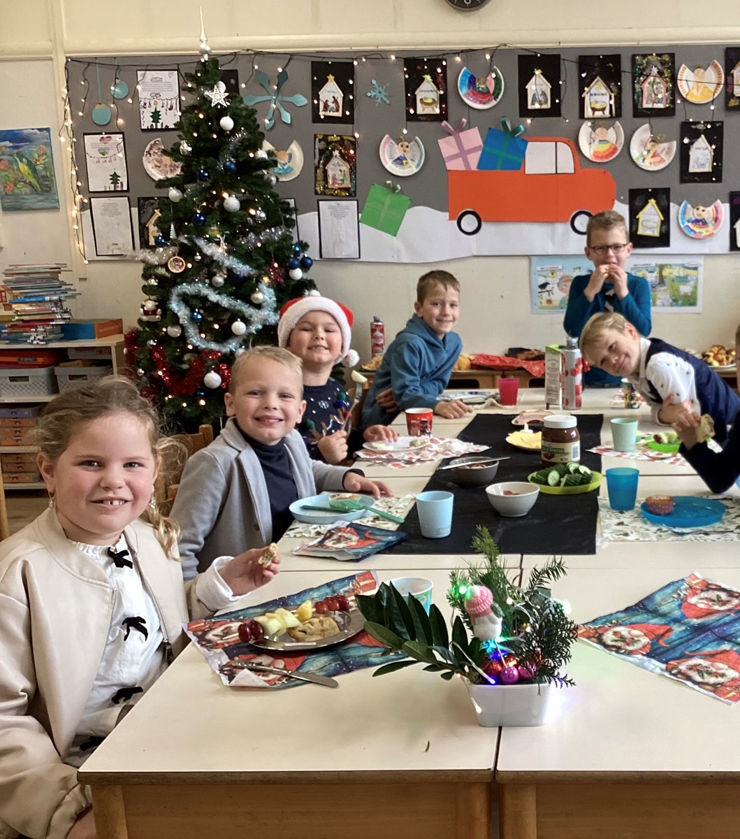 We begonnen in de gymzaal waar we een gezamenlijke viering hadden. We zongen liedjes en juf Petra las het kerstverhaal voor.