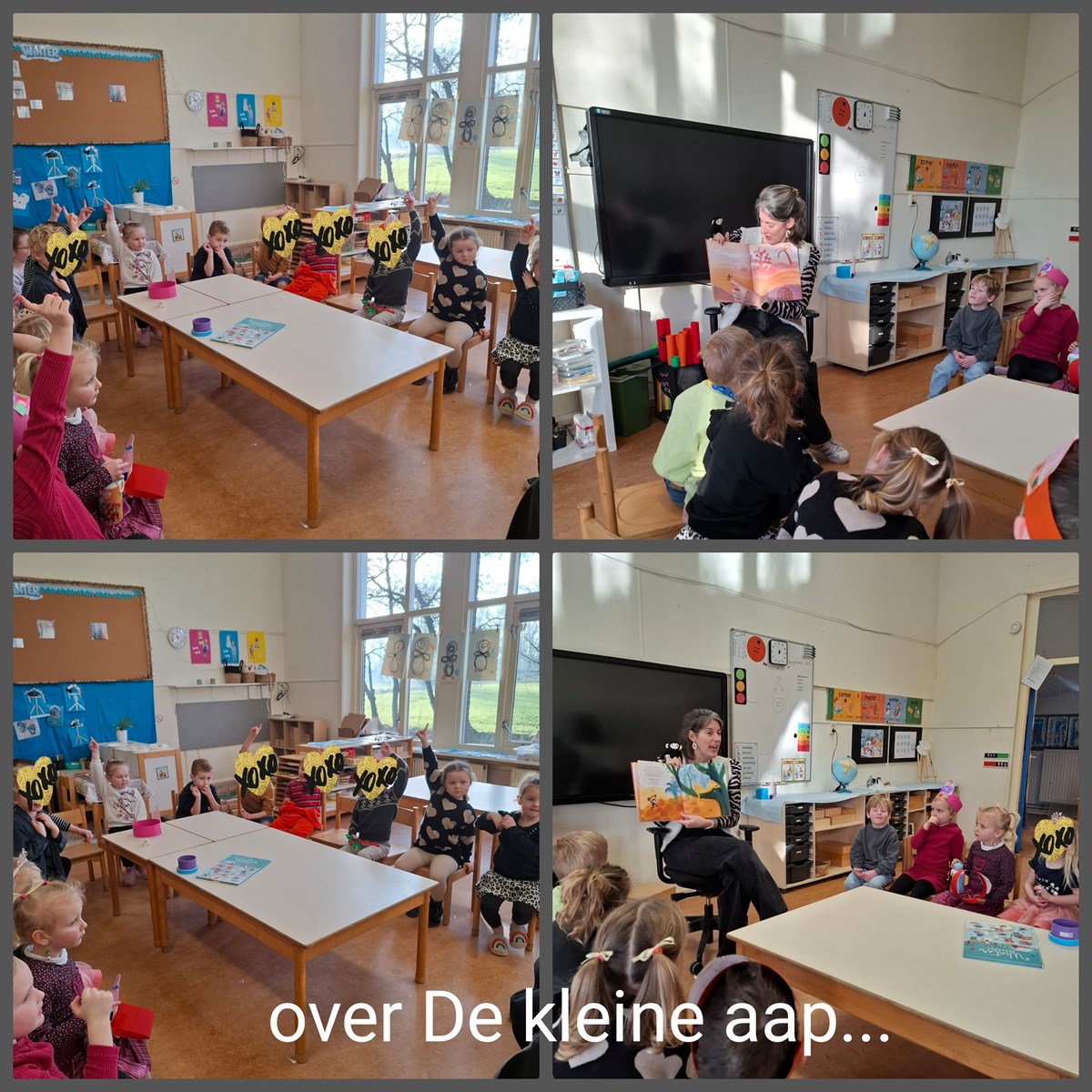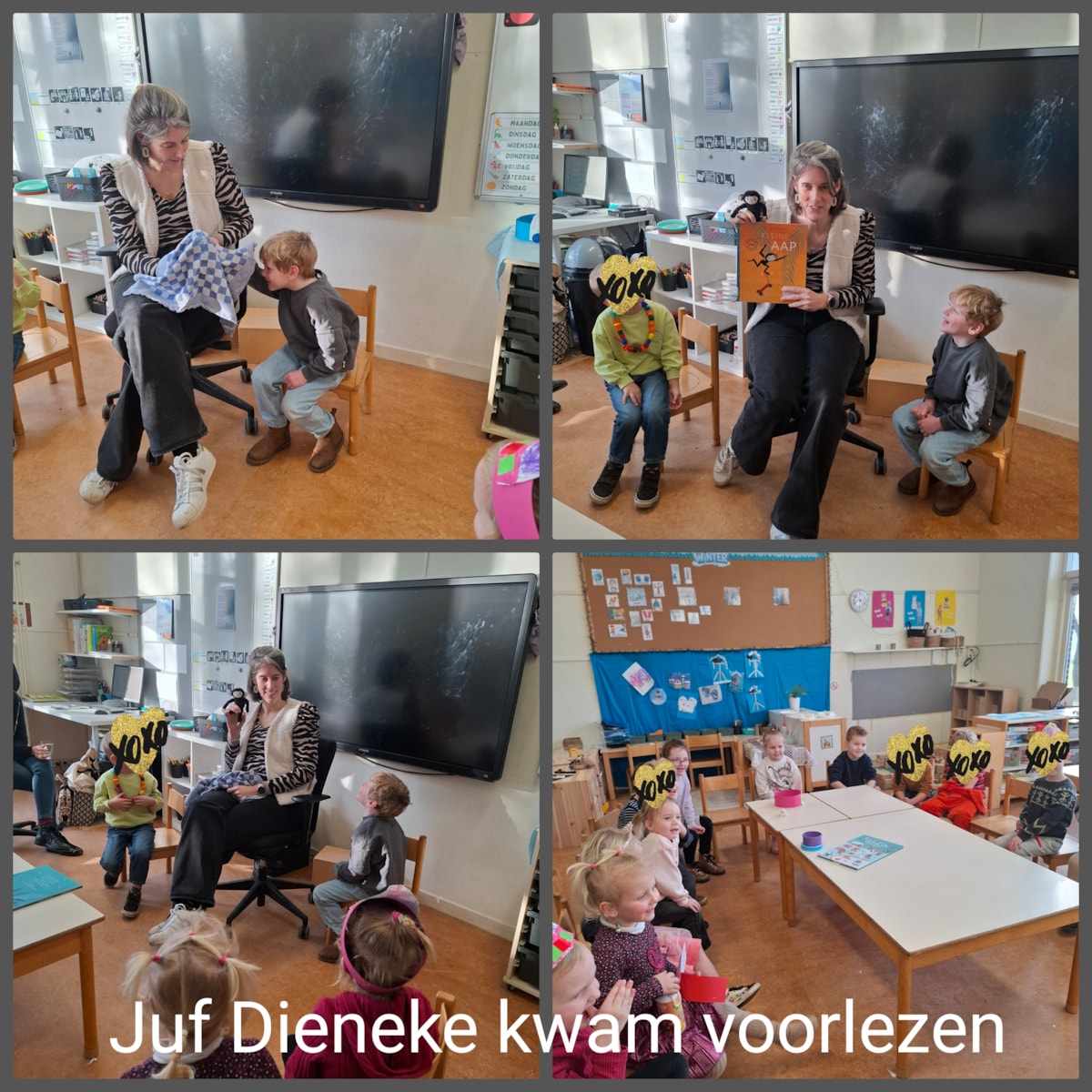 Wij zijn gestart wij met de Nationale Voorleesdagen. Tijdens deze landelijke leesweek staat het (voor)lezen centraal. Samen lezen, luisteren naar verhalen en hierover praten is ontzettend waardevol, zeker voor jonge kinderen, maar eigenlijk voor iedereen. En daarom kwam juf Dieneke bij ons in de klas een prentenboek voorlezen: De kleine aap met ook echt een klein aapje erbij!
