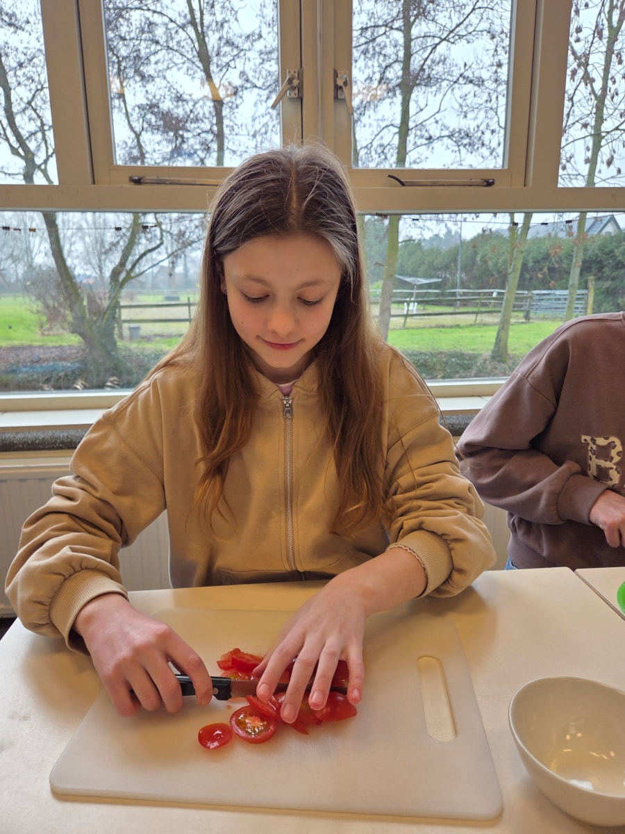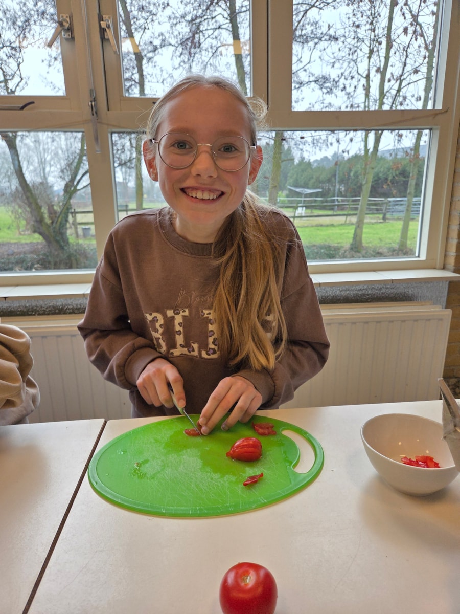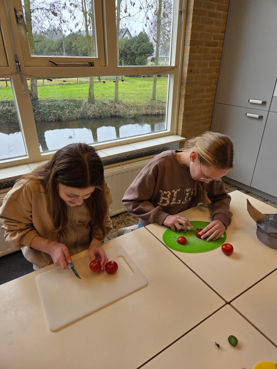 De pizza’s werden in de oven opgewarmd en ondertussen waren er veel kinderen die hielpen met het snijden van alle groente.